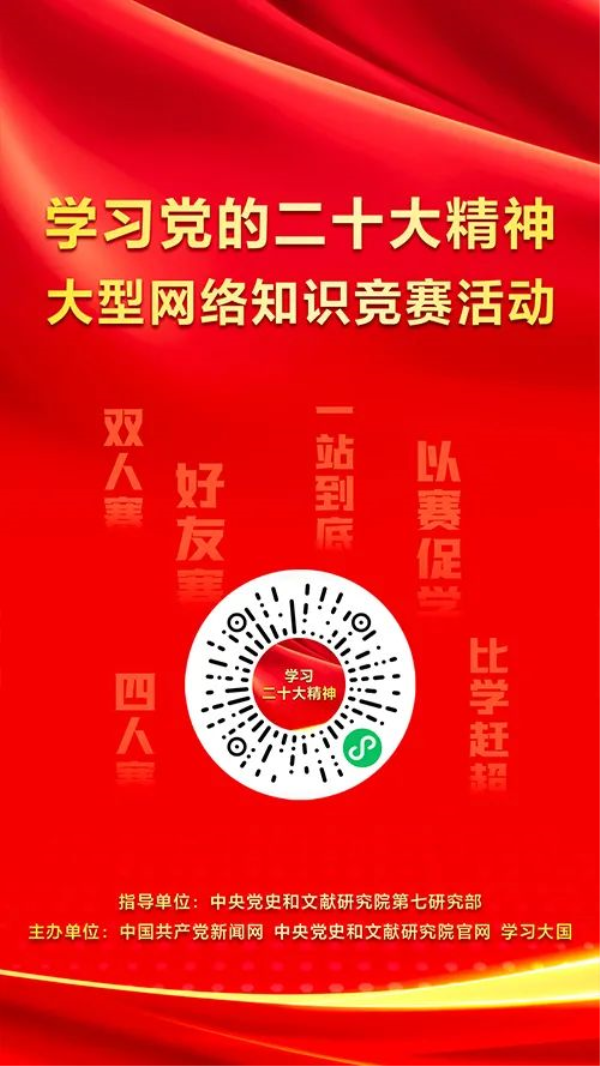 為學(xué)習(xí)宣傳貫徹黨的二十大精神,引導(dǎo)廣大干部群眾深入學(xué)習(xí)黨的二十大報(bào)告和黨章,認(rèn)真領(lǐng)悟黨的二十大提出的新思想新論斷、作出的新部署新要求,推動黨的二十大精神廣泛深入為廣大干部群眾所了解和掌握,“學(xué)習(xí)黨的二十大精神”大型網(wǎng)絡(luò)知識競賽活動正式啟動。